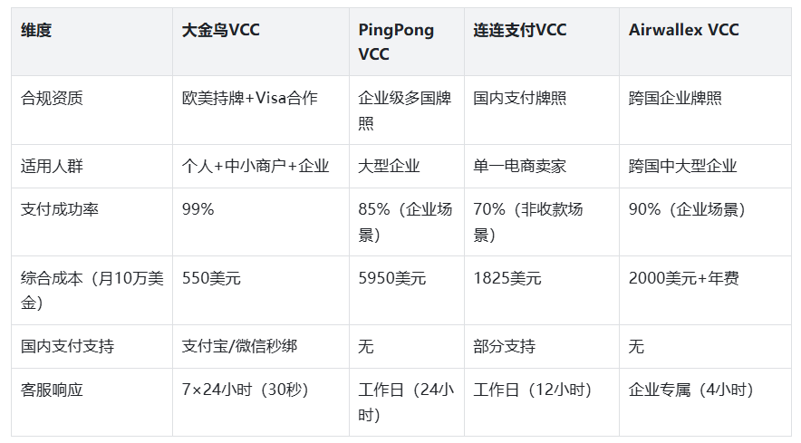 对国内多数用户而言,VCC的“靠谱”从来不是“品牌够大”“功能够复杂”,而是“安全、好用、省钱”。PingPong、Airwallex适配大型企业,连连支付聚焦单一电商,而大金鸟VCC则精准击中个人与中小商户的核心需求——全场景覆盖、合规安全、成本透明、服务及时。