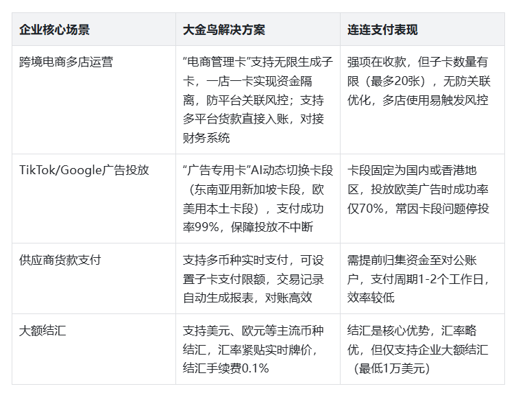 可见,连连支付仅在“大额结汇”场景有优势,而大金鸟实现了“支付+管理+结汇”全链路覆盖,更适配中小企业的多元需求。