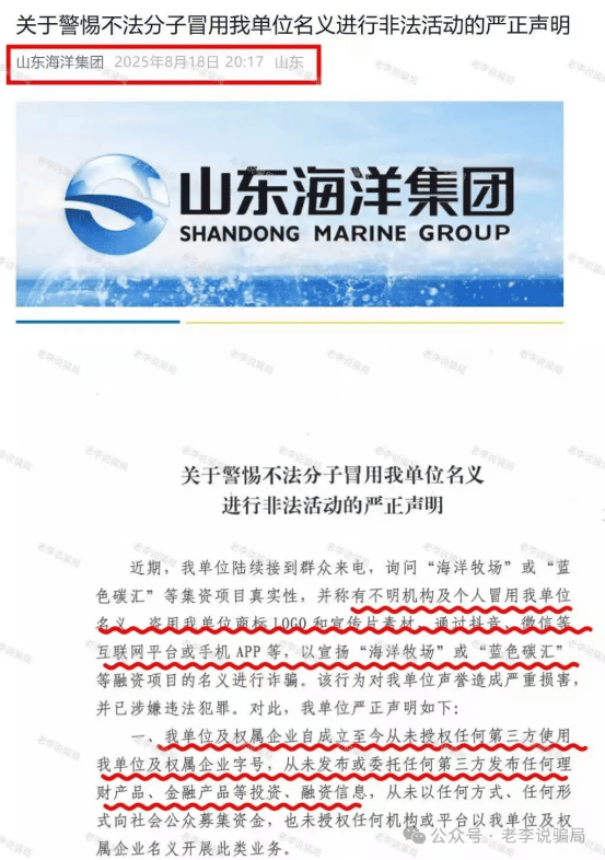 2025年8月18日,山东海洋集团发布声明,称被冒用名义宣传“海洋牧场”“蓝色碳汇”等融资项目,均属诈骗。